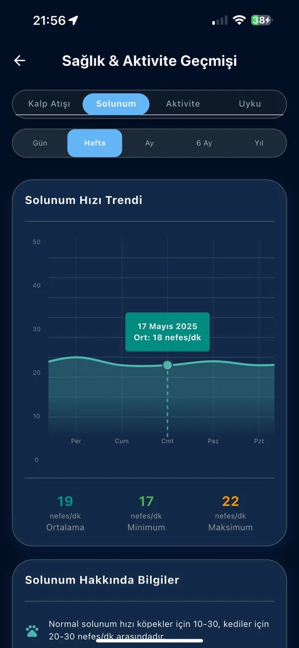 7/24 kalp atış hızını izleyin. Anormal değerlerde anında bildirim alın ve veteriner kontrolü için detaylı raporlar oluşturun.